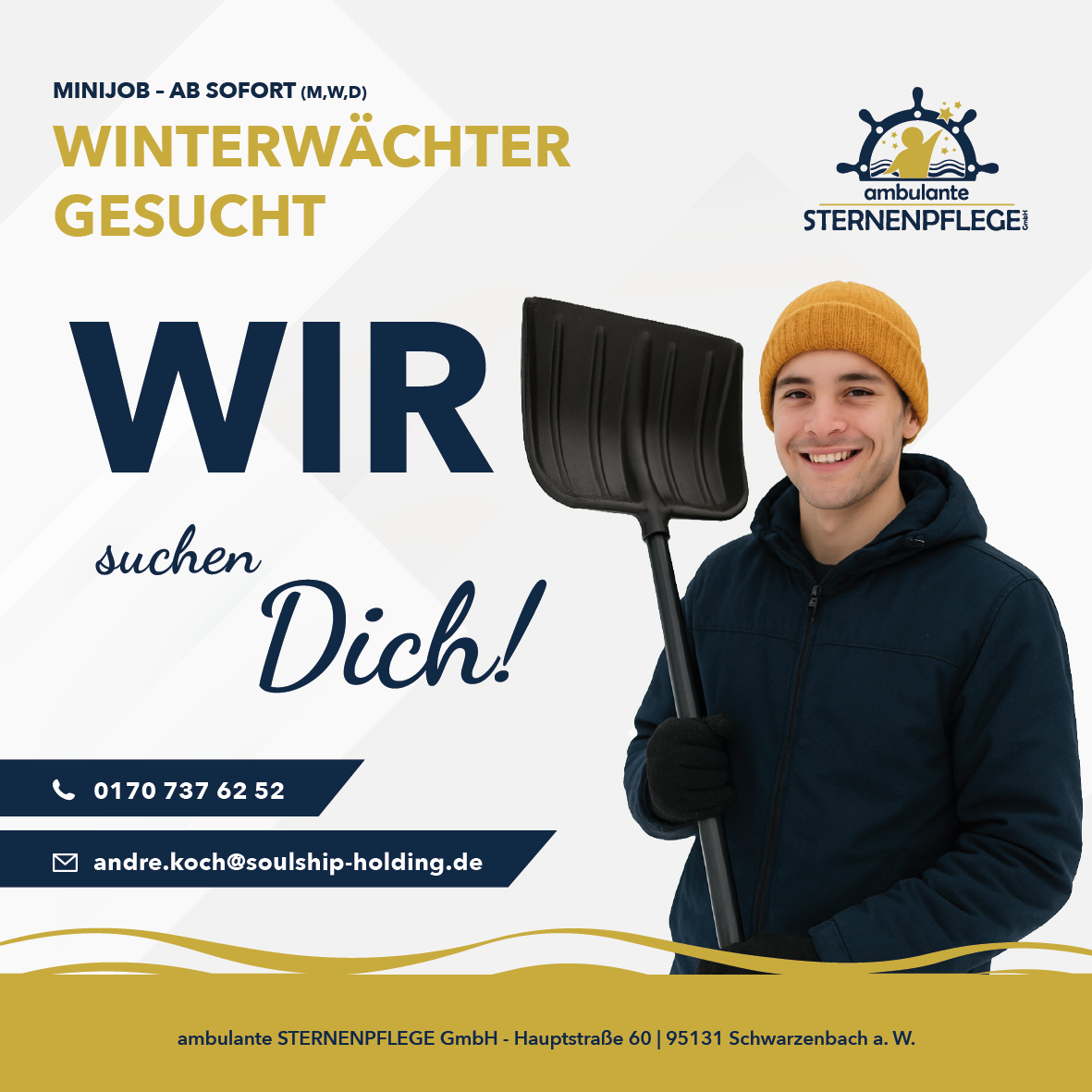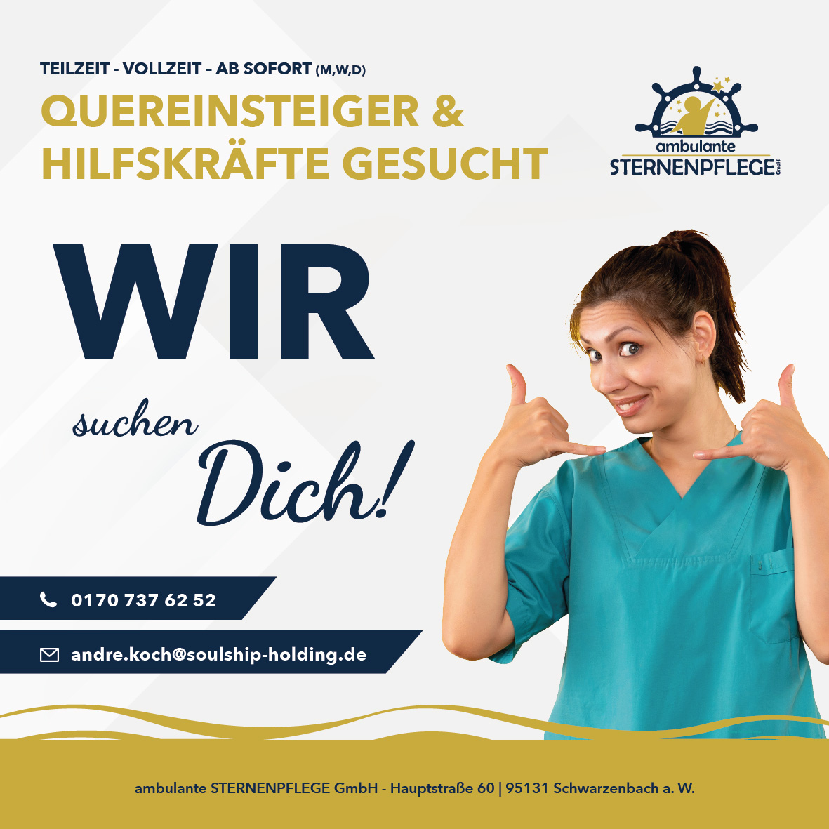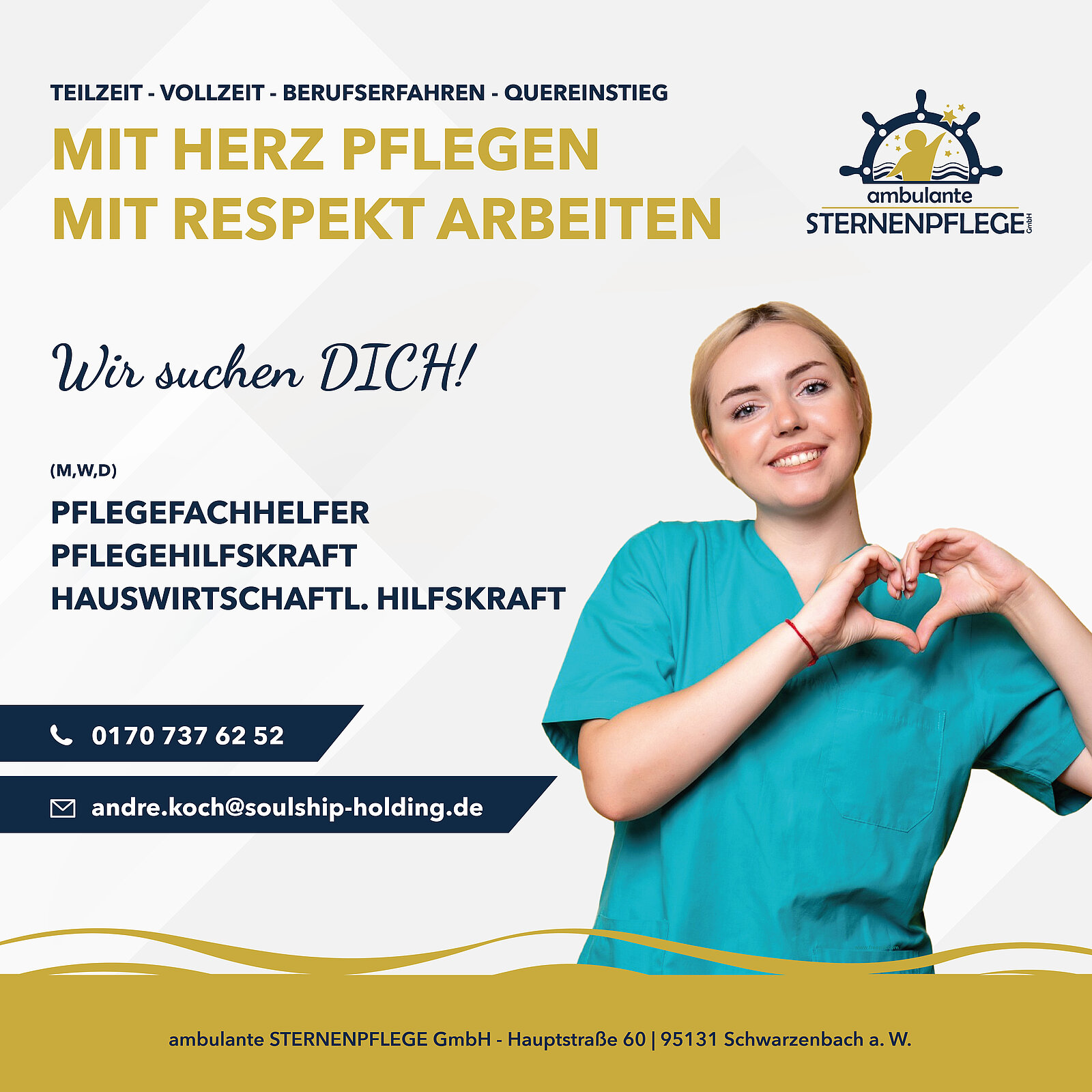 Du hast Lust Teil dieses auftrebenden Teams zu werden, möchtest neue Herausforderungen und willst mit Herzblut älteren Menschen helfen? Dich erwartet ein tolles, motiviertes und manchmal auch verrücktes Team. Wenn du dich angesprochen fühlst, bewerbe dich gerne. Dies ist sowohl über das Bewerbungsformular möglich, als auch an unseren Personalleiter André Koch per Mail andre.koch@soulship-holding.de oder Whatsapp an die 01707376252.